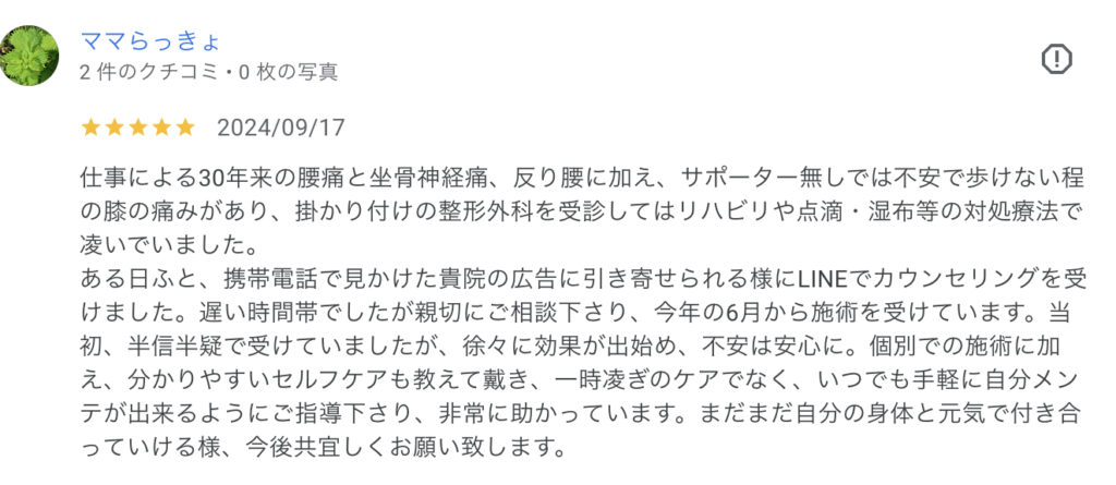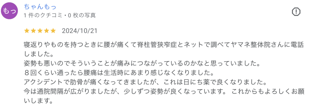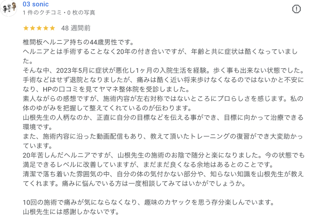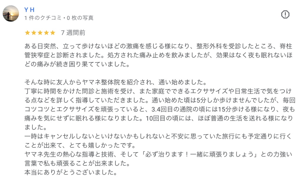 普通の接骨院ではマッサージ中に常に痛みが伴っていたのですが、やまね整体院での施術は全く痛みが伴いませんでした。