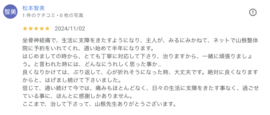 7年ぶり来院。歩くのも辛い状態から、2回で仕事復帰へ。【50代/坐骨神経痛】