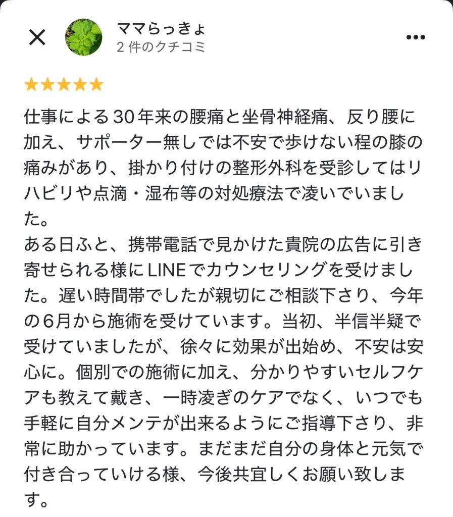 ホームページに書いている通りですね。指圧やマッサージのように強い刺激などは全くなくて、撫でるような施術なので最初は「効くんかな?」という疑いがありました。回数を重ねると改善しました!